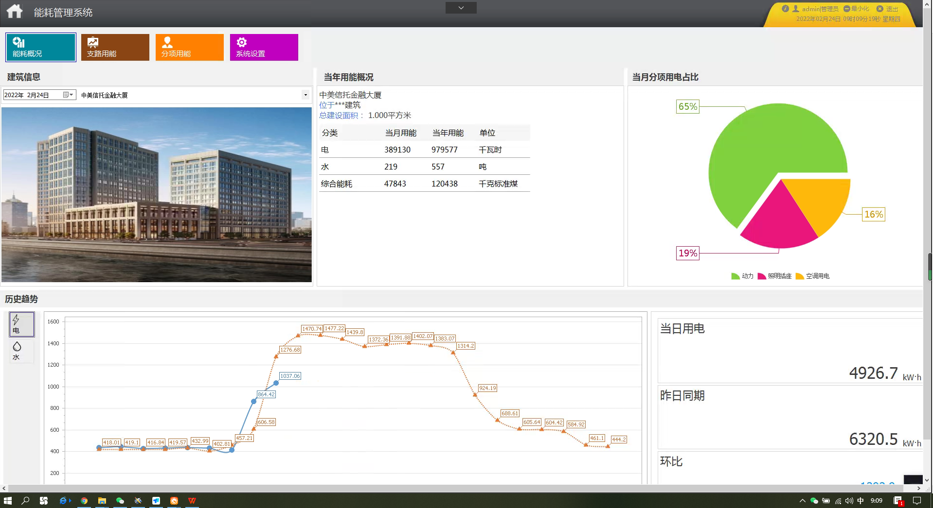 Acrel-5000能耗管理系統登陸成功進入主頁面,主頁面顯示該建筑的建筑圖片,建筑基本信息,建筑當月分項用電餅圖和各種能源的消耗量。根據所選的建筑,對其建筑圖片進行加載,可以選擇時間查看建筑能耗情況,選擇建筑或時間后自動刷新,默認為當天。