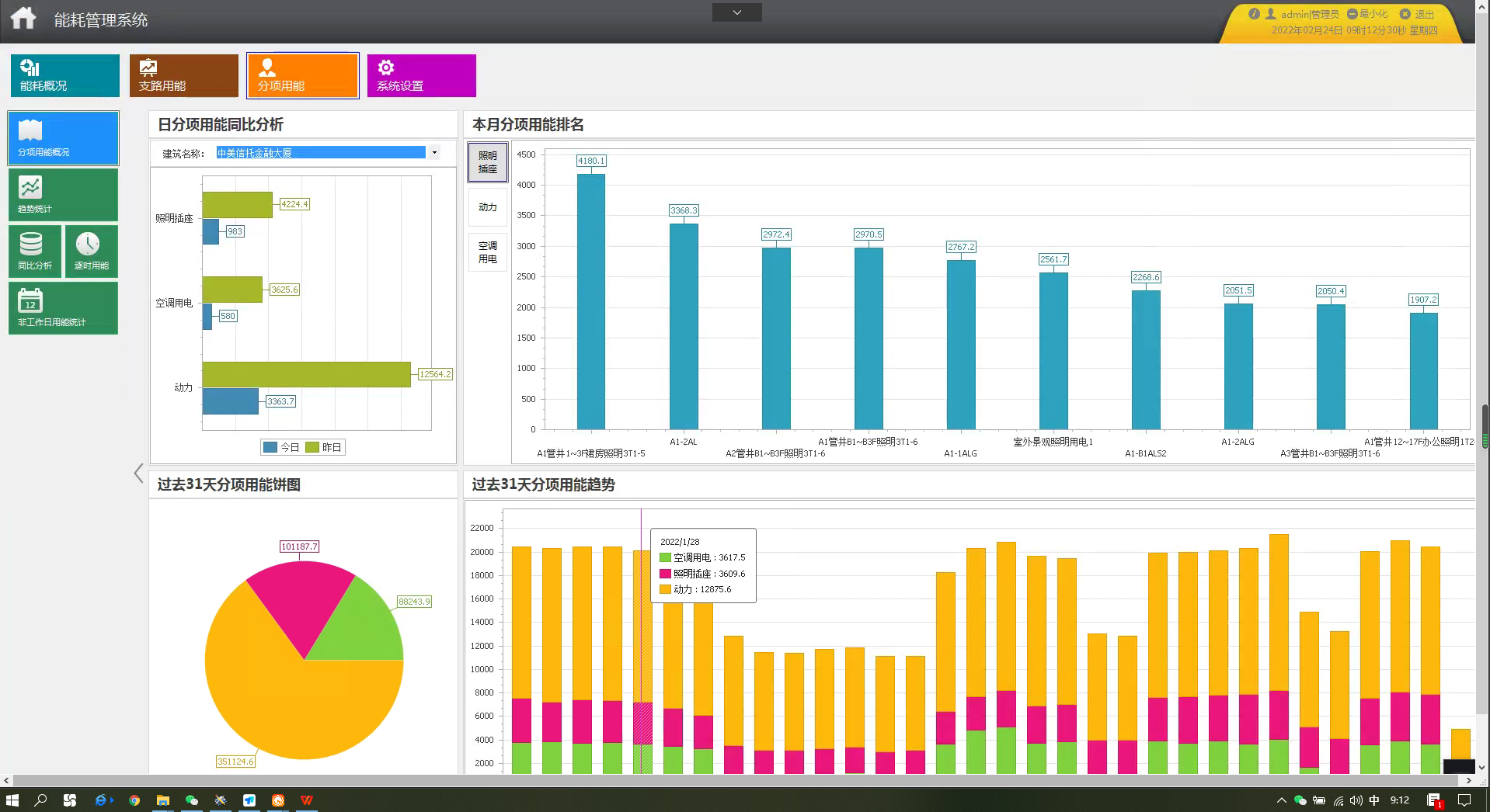 Acrel-5000能耗管理系統可以按照分項進行能耗統計與顯示。其中,日分項用能同比分析圖顯示不同分項的當日與昨日能耗柱狀圖(藍色柱表示今日,綠色柱表示昨日);用能餅圖顯示各分項過去31天的用能占比;堆積圖顯示各分項過去31天的能耗趨勢;分項用能排名圖顯示被選中分項對應能耗值排名前10位的支路。