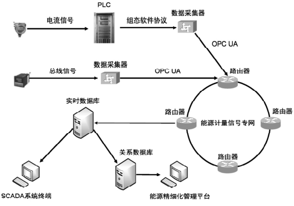 為實現底層儀表數據的穩定以及快速傳輸,現場設置的是MOXA數據采集器,將現場的儀表信號統一以OPCUA協議傳輸至能源計量信號專網。